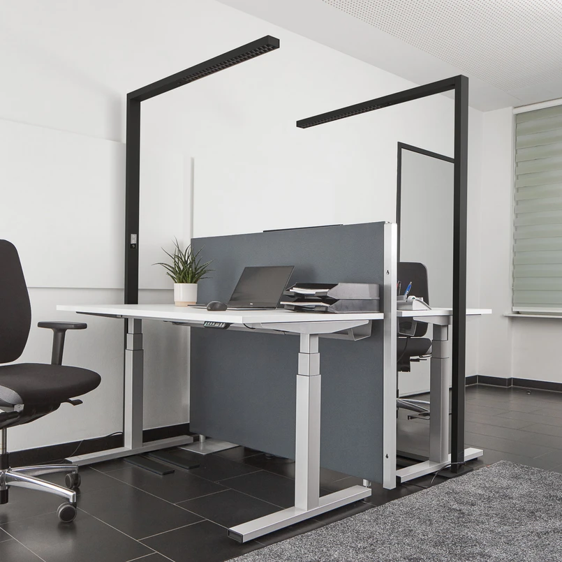 Funkcjonalna biurowa lampa podłogowa LED Jolinda z czujnikiem światła dziennego, czujnikiem ruchu, ściemnianym i bezpośrednim/pośrednim oświetleniem Jolinda ma minimalistyczny, bardzo nowoczesny wygląd, ponieważ lampa podłogowa składa się w zasadzie tylko z dwóch wąskich belek, które są ustawione względem siebie pod kątem prostym. Światło świeci w górę i w dół, praktycznie bez oślepiania w dół, zapewniając bardzo przyjemne oświetlenie, które jest idealne do długich okresów skoncentrowanej pracy przy biurku. Lampa stojąca LED nadaje się do oświetlania biurka, na które dociera wówczas jasne światło. Należy również wspomnieć o wysokim poziomie funkcjonalności, ponieważ Jolinda posiada nie tylko funkcję ściemniania, ale jest również sterowana za pomocą czujnika światła dziennego i czujnika ruchu. Po trzydziestu minutach nieobecności oprawa wyłącza się, a czujnik światła dziennego zapewnia względnie stałą jasność w pomieszczeniu, ponieważ światło z lampy stojącej LED staje się jaśniejsze lub ciemniejsze w zależności od jasności zewnętrznej - z podstawą w kształcie litery U - UGR < 6 Oprawy są zoptymalizowane tak, aby zapewnić idealne, nieoślepiające i równomierne oświetlenie standardowego biurka o wymiarach 160 cm x 80 cm. Dlatego zaleca się stosowanie jednej lampy na biurko.