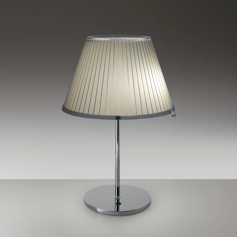 Regulowana lampa stołowa Choose z eleganckim pergaminowym kloszemDzięki lampie stołowej Choose renomowanego producenta oświetlenia Artemide do prywatnych i komercyjnych pomieszczeń mieszkalnych wkracza obiekt oświetleniowy, który ma do zaoferowania nie tylko wiele pod względem wzornictwa, ale także funkcjonalności. Przede wszystkim klosz z poliwęglanu i składanego pergaminu w połączeniu z klasyczną metalową podstawą wykończoną szlachetnym lakierem stanowi szczególnie atrakcyjną koncepcję wzorniczą. Szczególną cechą jest to, że klosz można obracać, a także odchylać za pomocą małej dźwigni, aby w każdej chwili móc dostosować strumień światła do okoliczności. - Obrót: 350°- Nachylenie: 30 cm