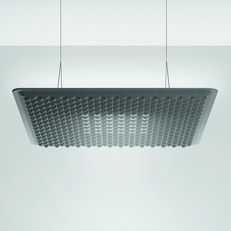 Lampa wisząca biurowa LED Eggboard Matrix w formacie 80 x 80 cm - światło bezpośrednie i pośrednie, dźwiękochłonne Materiał, z którego wykonana jest lampa wisząca LED Eggboard Matrix ma właściwości dźwiękochłonne, które są dodatkowo wzmacniane przez sinusoidalną strukturę powierzchni. Sprzyja to akustyce pomieszczenia, która ułatwia wzajemne zrozumienie podczas rozmów i zapewnia wydajność akustyczną. Eggboard Matrix zapewnia zarówno światło pośrednie przez Deck, jak i bezpośrednie oświetlenie zadaniowe. Dzięki rotosymetrycznym reflektorom i licznym pojedynczym diodom LED, to ostatnie daje jednorodny i przyjemny efekt. Żyrandol LED Eggboard Matrix został opracowany przez Progetto CMR i wyprodukowany przez włoską firmę Artemide, która od momentu założenia w 1960 roku przez Ernesto Gismondiego jest synonimem produktów, które nie pozostawiają nic do życzenia pod względem wzornictwa i funkcjonalności. Filozofia Artemide polegająca na tworzeniu oświetlenia dostosowanego do ludzkich potrzeb jest szczególnie wyraźnie uosabiana przez Eggboard Matrix - zewnętrznie Dali