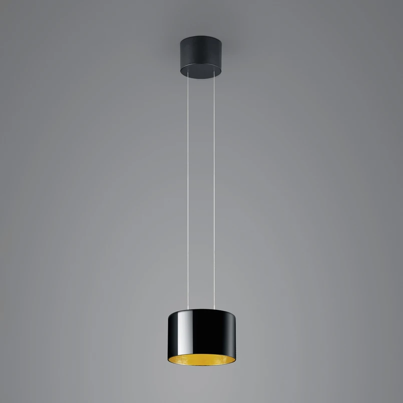 Elegancka lampa wisząca LED Luce elevata Grand przekonuje zarówno pod względem technicznym, jak i optycznym. Z czaszy wykonanej z lakierowanego na czarno aluminium, jej klosz wykonany ze szkła, które również jest w kolorze czarnym, schodzi za pomocą dwóch linek. Luce elevata oznacza szczególnie wysokiej jakości oprawy firmy BANKAMP i dlatego wewnętrzna strona klosza ma wygląd płatków złota.