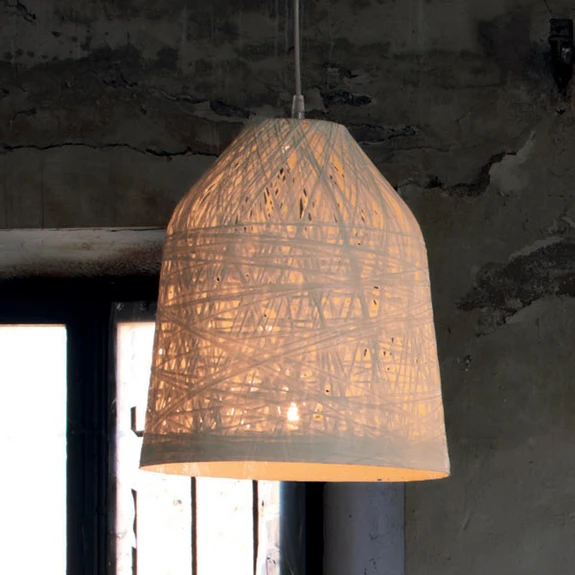 Klosz tej lampy wiszącej Black Out stanowi unikat ze względu na swe niezwykłe wykonanie. Wytwarzany jest ręcznie we Włoszech. Podczas produkcji tego klosza włókno szklane jest owijane wokół obracającego się modelu klosza do momentu aż powstanie korpus, w którym będą tylko maleńkie prześwity. Przez te prześwity przenika światło i następnie przedostaje się do pomieszczenia.
