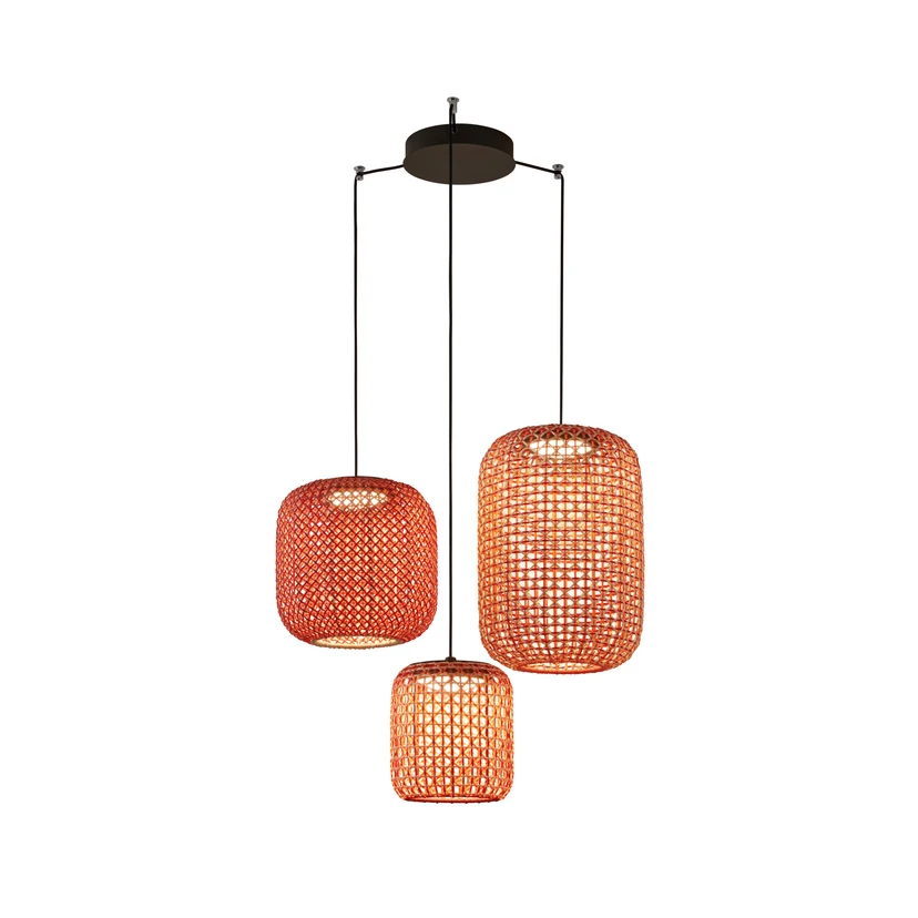 Designerska lampa wisząca Nans S/3L z trzema kloszami o różnych rozmiarachFirma projektowa Bover z siedzibą w Barcelonie uosabia śródziemnomorski styl życia dzięki swoim produktom Made in Spain. Lampa wisząca Nans została zaprojektowana do oświetlania większych powierzchni, ponieważ jej trzy klosze można zawiesić w różnych odległościach od czaszy, a długość kabla jest bardzo duża. Trzy cylindryczne klosze o różnych rozmiarach są utkane z syntetycznego włókna, w które wpleciono różnokolorowe nici. Lampę wiszącą można ściemniać za pomocą triaka, ściemniacz nie jest dołączony do zestawu.