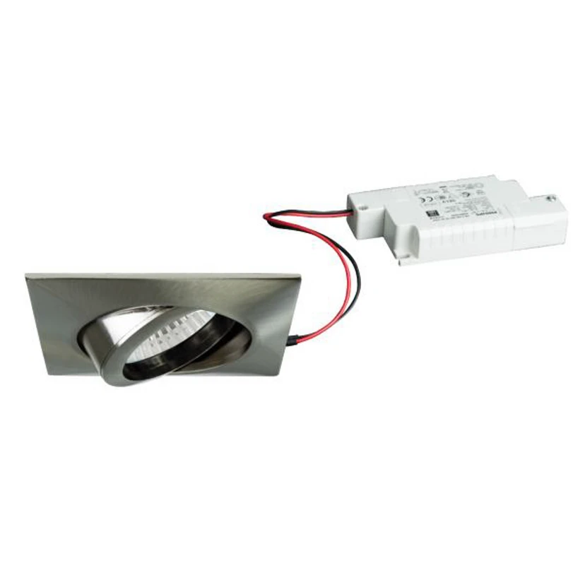Zestaw reflektorów wpuszczanych LED BB14 ze ściemniaczem fazowym (RC) Zestaw reflektorów wpuszczanych LED BB14 składa się z reflektora wpuszczanego z kwadratową ramą i sterownika LED, który można ściemniać za pomocą ściemniacza fazowego (RC). Ciepłe, białe światło jest emitowane pod kątem 38°, przy czym kierunek stożka świetlnego można regulować o 25° dzięki opcji obrotu reflektora. Zestaw downlight jest wyposażony w funkcję dim-2-warm. Jeśli downlight jest ściemniany za pomocą zewnętrznego ściemniacza odcinającego fazę, funkcja ta zmienia barwę światła. Przy pełnej jasności emitowane jest ciepłobiałe światło o temperaturze barwowej 3 000 K; przy ściemnianiu temperatura barwowa jest redukowana do 1 800 K przy najniższym poziomie ściemniania. - w zestawie elektroniczny układ sterowania, ściemnialna sekcja fazowa (RC) - srebrny odbłyśnik z obrotowo symetrycznym rozsyłem światła o dużej szerokości - przezroczysta szklana osłona - bez osłony z materiałem termoizolacyjnym