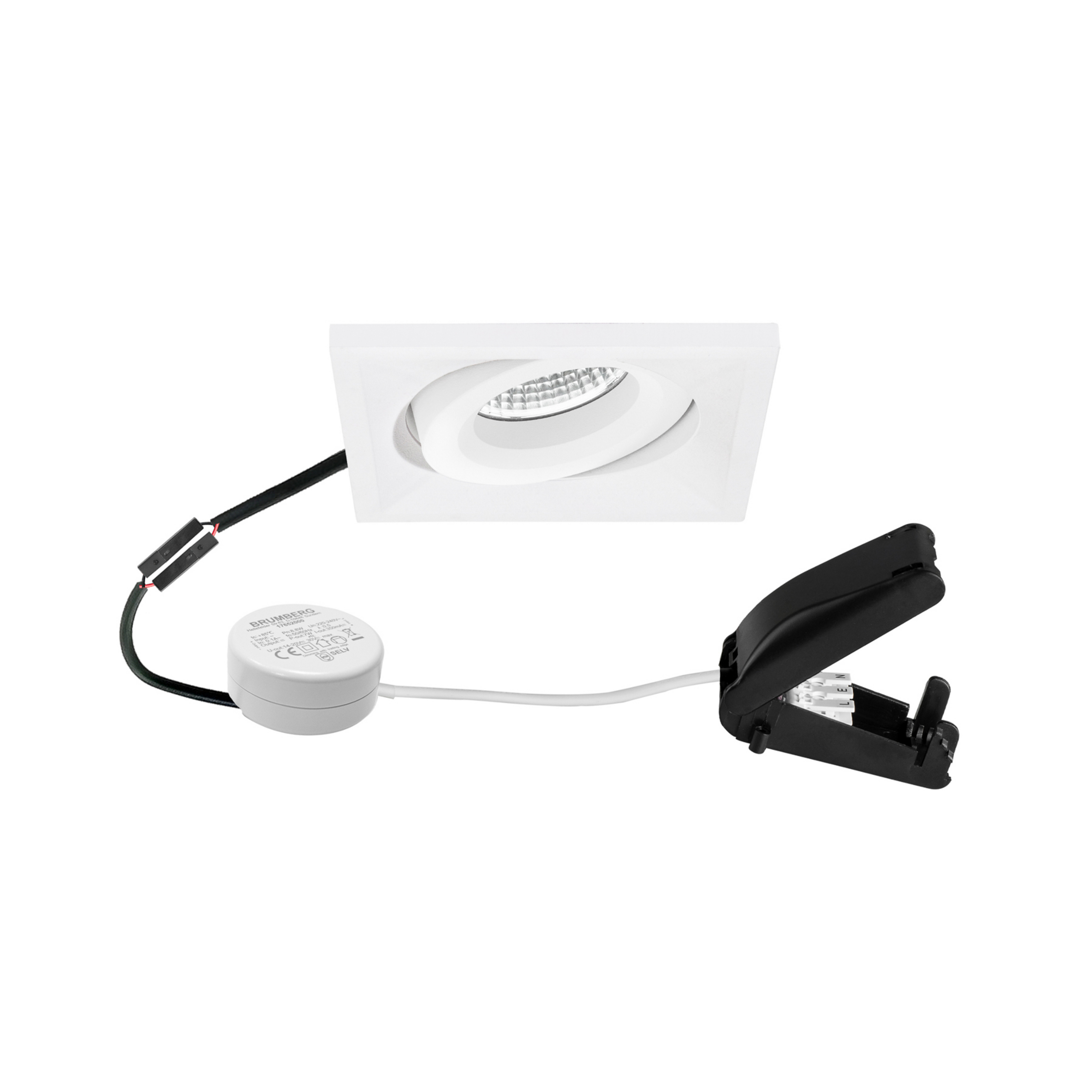 Reflektor wpuszczany LED BB37 z okrągłym sterownikiem LED, ściemnianym i puszką przyłączeniową Reflektor wpuszczany LED BB37, obracany o 20°, ma kwadratową ramę i może być montowany w sufitach o grubości do 1,5 cm bez użycia narzędzi za pomocą sprężyn montażowych. Dostarczany jest jako gotowy do podłączenia zestaw na 230 V z okrągłym sterownikiem LED z trybem odcinania fazy (RC) i skrzynką przyłączeniową. Dobra skuteczność świetlna i optymalny rozsył światła są gwarantowane przez srebrny reflektor o obrotowo symetrycznym, wąsko-szerokim rozsyle światła i przezroczystą osłonę z poliwęglanu - w zestawie okrągły, elektroniczny sterownik, ściemniany fazowo - w zestawie puszka przyłączeniowa, 3-stykowa do okablowania przelotowego - dopuszczalna temperatura otoczenia (ta): -20 °C - +25 °C - spot można obracać o 20° dookoła - maksymalna grubość sufitu 1,5 cm