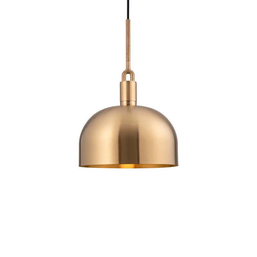 Lampa wisząca Forked wykonana w całości z mosiądzu z otwartym kloszemLampa wisząca Forked jest wykonana z mosiądzu. Składa się z szeroko otwartego klosza, w kształcie półkuli, gniazda zdobionego ręcznie pięknym radełkowanym wzorem oraz prostego, okrągłego daszka. Radełkowany wzór z napisem na oprawie jest znakiem rozpoznawczym opraw producenta Buster Punch i można go znaleźć na każdej oprawie. Równie charakterystyczne dla Buster Punch jest przetwarzanie wysokiej jakości, solidnych metali na wszystkie produkty. Oprócz opraw oświetleniowych firma produkuje również oprawy i wyposażenie. W kloszu zamontowano oprawkę E27, w zakresie dostawy znajduje się pasująca, świecąca ciepłą bielą lampa LED. Światło można również przyciemnić za pomocą ściemniacza odpowiedniego do lamp LED. Światło wydobywa się z metalowego klosza wyłącznie przez otwór i oświetla powierzchnię znajdującą się poniżej, na przykład stół jadalny. Lampa wisząca Forked to produkt angielskiego producenta Buster Punch, firmy, która powstała w Londynie w 2013 roku. Wszystkie produkty firmy Buster Punch składają się z wysokiej jakości, częściowo litych metali i posiadają charakterystyczne cechy etykiety. Odlewane gniazda i charakterystyczne radełkowanie liniowe w szlifie diamentowym, a także dopracowanie w pracy ręcznej są znakiem rozpoznawczym etykiety lampy