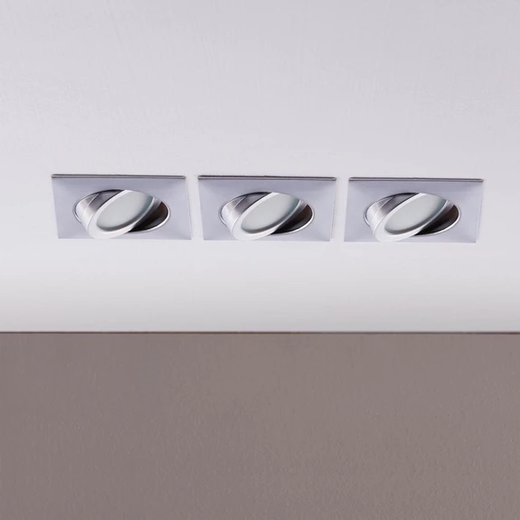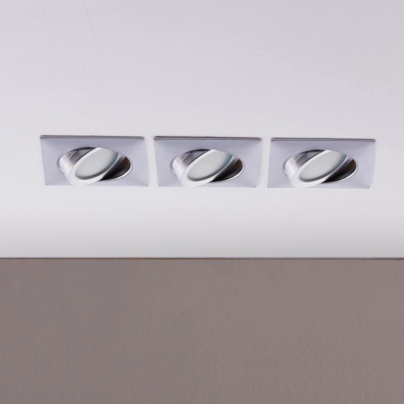 Ultrapłaskie, kątowe chromowane lampy wpuszczane Andrej z energooszczędnymi diodami LED w praktycznym zestawie 3 sztuk Lampy wpuszczane rzadko są używane jako samodzielne urządzenia; częściej instaluje się kilka w rzędzie lub w pewnych odległościach od siebie. W takich przypadkach zaleca się zakup zestawu trzech opraw wpuszczanych, jak pokazano na przykład tutaj. Lampa wpuszczana LED Andrej zdobywa punkty dzięki błyszczącej chromowanej powierzchni i tym samym przyczynia się do nowoczesnego wystroju salonu. Nie ma potrzeby martwić się o zużycie energii, ponieważ dzięki technologii LED pozostaje ono na niskim poziomie. Wkład wewnętrzny można obracać o maksymalnie 25° w obu kierunkach. Głębokość montażu jest bardzo niewielka.