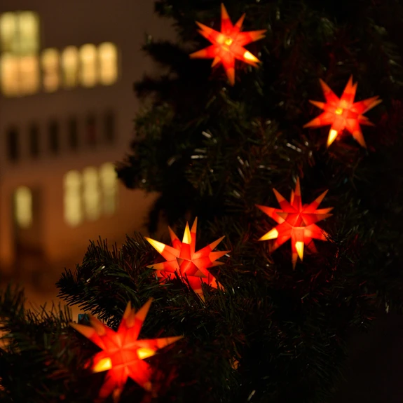 Czerwone, 18-punktowe gwiazdy z żółtymi końcówkami, które nadają gwiezdnej urodzie specjalny efekt, ustawione są w odstępach 100 cm na tym łańcuchu świetlnym, nadającym się do zastosowania w pomieszczeniach i na zewnątrz. Gwiazdy wykonane są z tworzywa sztucznego, które jest odporne na mróz i deszcz. Po wyłączeniu gwiazdy zachwycają już swoim szczególnym kształtem. Zaraz po włączeniu świateł gwiazdy świecą ciepłym, białym światłem. Wyposażony w czarny kabel. Klamry do mocowania łańcucha świetlnego, np. do drzewa lub girlandy, są już zawarte w dostawie. W zestawie znajduje się również transformator zewnętrzny.
