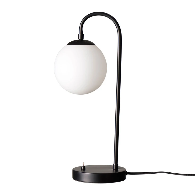 Matowa, lakierowana na czarno metalowa rama z okrągłą podstawą i szerokim ramieniem z kokardą oraz opalową, białą kulą ze szkła, która jest przymocowana do ramienia skierowanego w dół - to właśnie lampa stołowa Café Paris duńskiej firmy oświetleniowej Dyberg Larsen. Można ją postawić na stole lub innym meblu jako dodatkowe źródło światła w salonie, jadalni lub na stoliku nocnym w sypialni. Dzięki kuli z opalowego białego szkła lampa stołowa Café Paris emituje bardzo równomierne oświetlenie, które nie oślepia. Włącznik lampy jest wygodnie umieszczony na okrągłej podstawie lampy.
