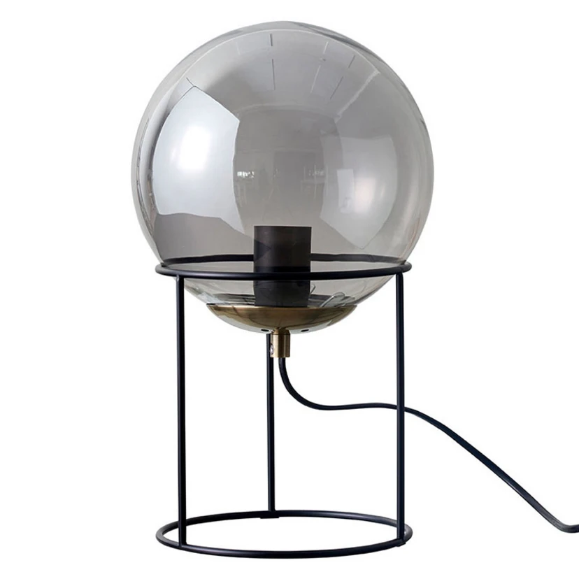 Lampa stołowa Moon z przezroczystą kulą z przydymionego szkła w metalowej oprawie