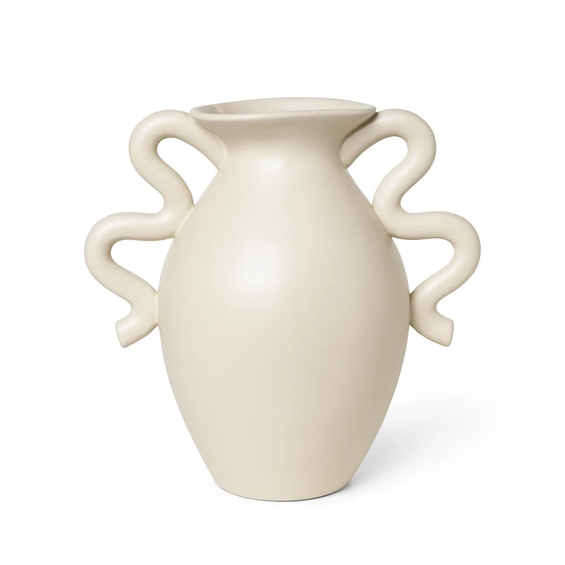 Wazon stołowy Verso z glazurowanej ceramiki Wazon stołowy Verso przypomina klasyczne kształty tradycyjnej ceramiki i charakteryzuje się nieregularnym, kobiecym kształtem oraz dwoma efektownymi i artystycznie zakrzywionymi uchwytami, które dodają nowoczesnego akcentu do ponadczasowego projektu. Wypełnij Verso swoimi ulubionymi kwiatami lub pozwól mu mówić samemu za siebie. Informacje o produkcie: Wykonany ze szkliwionej ceramiki. Wskazówki pielęgnacyjne: Wycierać wilgotną ściereczką.