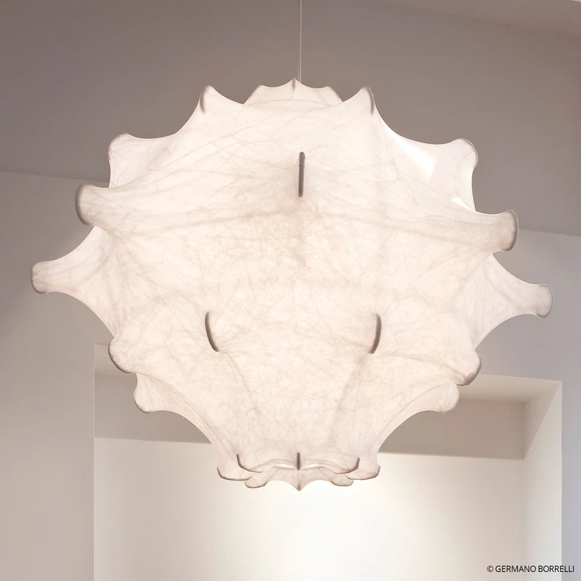 Designerska lampa wisząca Taraxacum marki FLOS o nietypowym kształcie Taraxacum to klasyk designu, który powstał w 1960 roku i do dziś nie stracił nic ze swojego uroku. Świadczy to o ponadczasowym charakterze tej lampy wiszącej, która tworzy pełne wdzięku, absolutnie przytulne światło, które wydaje się charakteryzować czystym komfortem. Na pierwszy rzut oka można by pomyśleć, że jest to zwykła tkanina owinięta wokół stalowej ramy klosza, ale jest to specjalny materiał znany jako kokon. Szybko łapiesz się na tym, że myślisz o kokonie, takim jak ten przędzony przez prządkę jedwabiu. I rzeczywiście, masz rację z tym mentalnym przeskokiem, ponieważ to nie tkanina ani dzianina nadaje Taraxacum wyjątkowy wyraz, ale w rzeczywistości drobna sieć nici, w której nić po nici została połączona wokół ramy, aż powstała cienka, ale gęsta tkanina, która jest ostatecznie mocowana za pomocą sprayu, aby zapewnić stabilny kształt i wystarczającą stabilność.