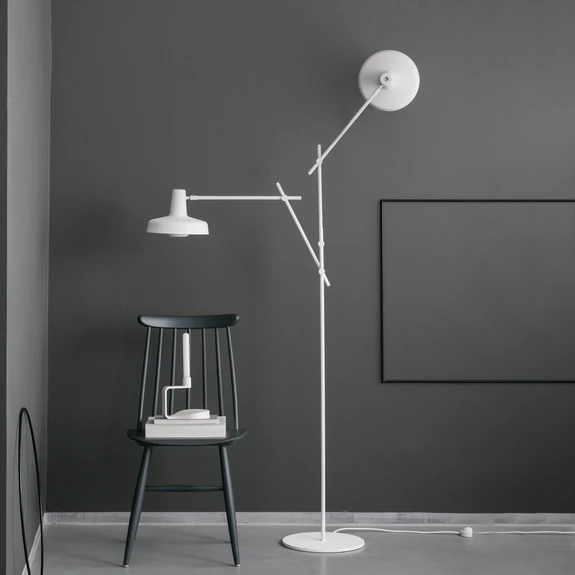 Lampa podłogowa Arigato chorwackiego producenta GRUPA to niezwykle uniwersalne źródło światła, które można łączyć z wieloma koncepcjami wyposażenia wnętrz i jest elastyczne w zakresie strumienia świetlnego. Na okrągłej podstawie zamontowana jest wysoka rama wykonana ze stali, która w górnej części dźwiga dwa bocznie wysuwane ramiona, które z kolei podzielone są na dwie sekcje i każda z nich mieści okrągły klosz wykonany z aluminium. Sekcje ramion i klosze są wyposażone w przeguby, które zapewniają ukierunkowanie światła w zależności od sytuacji. Również konstrukcja klosza jest przemyślana, z białą powierzchnią wewnętrzną zapewniającą niskostratną emisję światła oraz osłoną zapewniającą optymalny komfort widzenia.