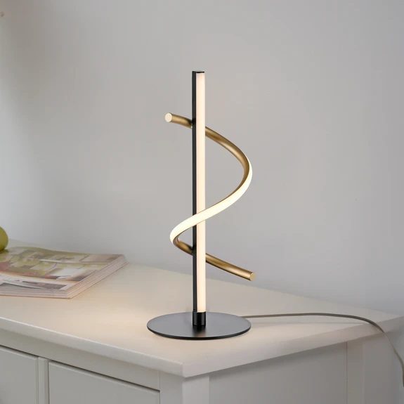 Lampa stołowa LED Emanda, czarna i w kolorze mosiądzu Lampa stołowa LED Emanda to nie tylko dodatkowe źródło światła do salonu lub sypialni, ale także obiekt dekoracyjny dzięki swojemu wyjątkowemu designowi. Z płaskiej, okrągłej podstawy pionowo wznosi się prosta kolumna, wokół której wije się metalowa spirala w kolorze mosiądzu. Oba elementy są wyposażone w satynowaną osłonę z jednej strony, za którą zainstalowano ciepłe, białe diody LED. Młode i dynamiczne wartości charakteryzują markę JUST LIGHT. - wcześniej znana jako Leuchten Direkt