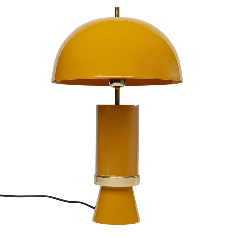 Lampa stołowa Josy - stylowe połączenie geometrycznych kształtów Lampa stołowa Josy przyciąga wzrok kolorystyką i połączeniem różnych geometrycznych elementów. Klosz został zaprojektowany jako półkula otwarta u dołu, z cylindrem poniżej i ściętym stożkiem jako podstawą. Josy ma błyszczące wykończenie i jest wykonana ze stali emaliowanej i pokrytej tytanem.