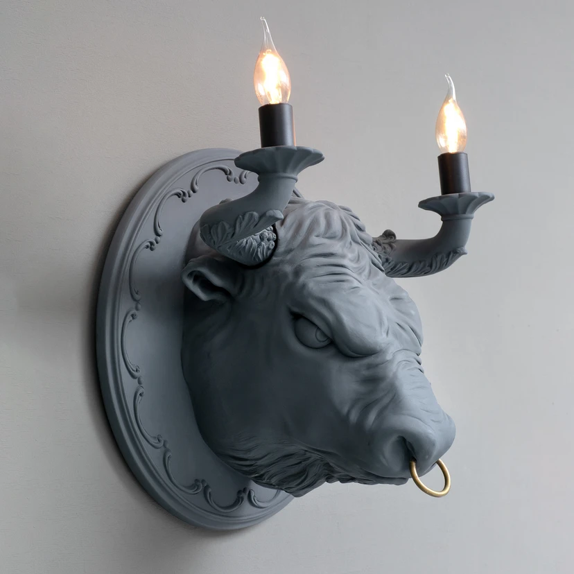 Przyciąga wzrok w korytarzach i salonach: lampa ścienna Corrado jest zaprojektowana w kształcie głowy byka, zawieszonej na okrągłej rozecie ściennej. Dwa rogi służą jako uchwyty dla dwóch podstawek E14. Aby oddać sprawiedliwość wzornictwu obiektu wyposażenia wnętrz, zaleca się wybór żarówek w kształcie świec (patrz akcesoria). Corrado jest wykonany głównie z ceramiki, jedynie pierścień na nosie jest wykonany z mosiądzu.