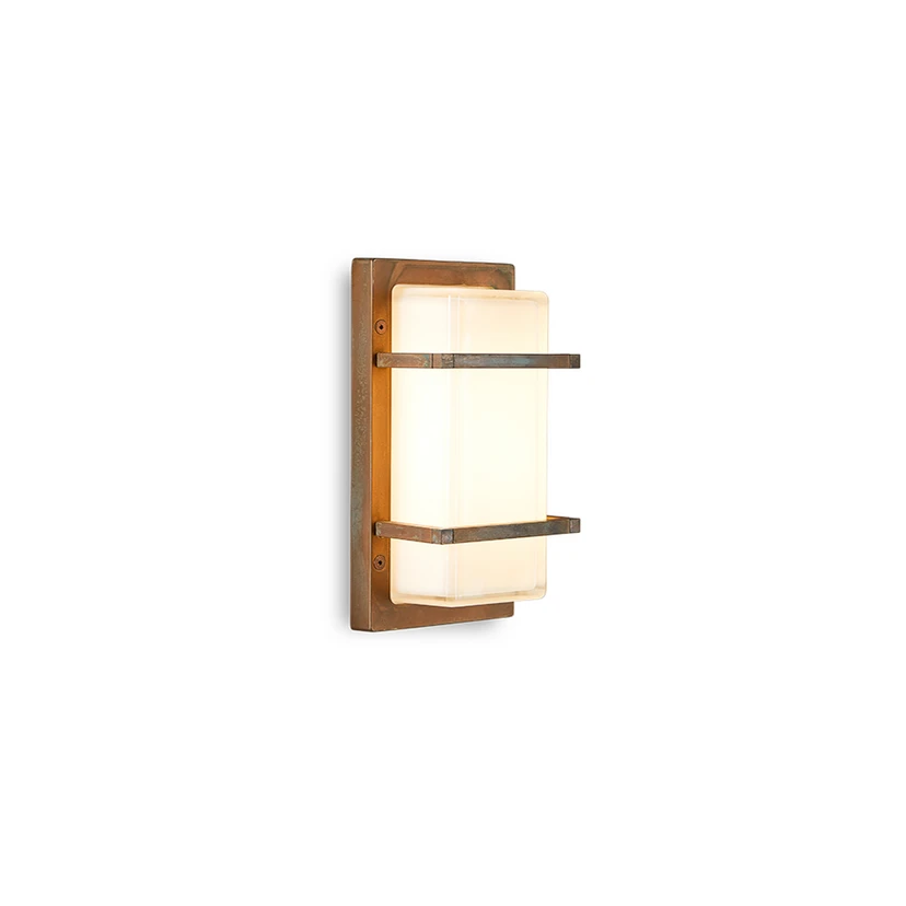 Zewnętrzna lampa ścienna Ice Cubic prezentuje się szlachetnie, ponadczasowo i z wysoką jakością. Został wyprodukowany we Włoszech z mosiądzu i szkła. Kanciasty, szklany klosz osadzony jest na mosiężnym uchwycie ściennym, poziomo zdobionym i zabezpieczonym przez dwie wąskie rozpórki, również wykonane z mosiądzu. Szkło matowe zapewnia bardzo równomierną emisję światła i zapobiega powstawaniu odblasków. Obszerna emisja światła we wszystkich kierunkach sprawia, że oprawa jest optymalnym źródłem światła dla strefy wejściowej. Oprawa wyposażona jest w gniazdo, można dowolnie dobierać naświetlacz w odpowiednim rozmiarze.