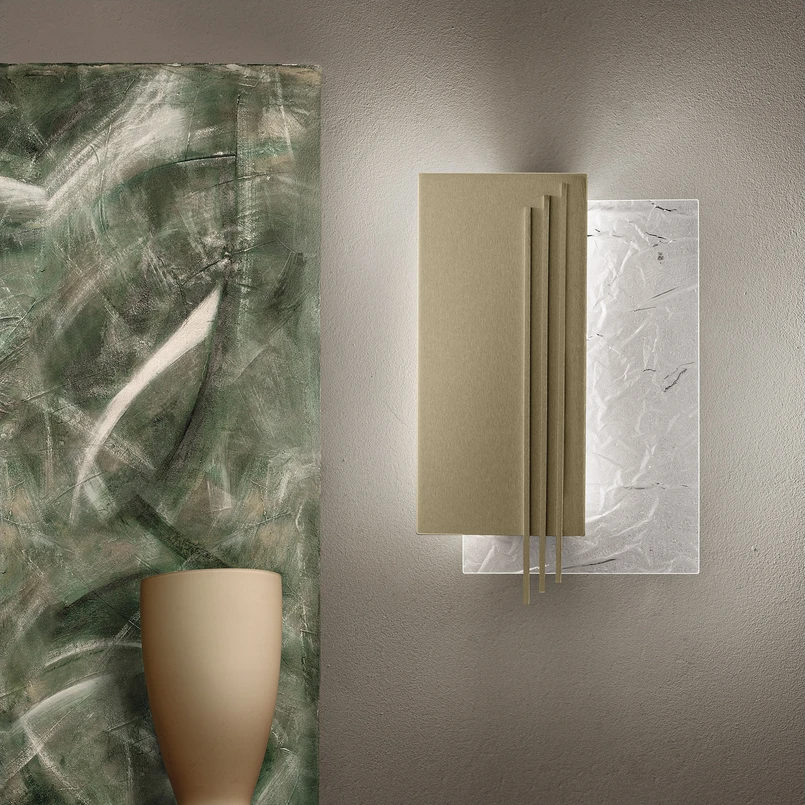 Made in Italy: lampa ścienna LED Artide z teksturowanym akrylowym kloszem, 3000 K, Ra90 Dzięki artystycznemu wzornictwu elegancka lampa ścienna LED Artide natychmiast przyciąga wzrok. Jego prostokątny klosz jest wykonany z przezroczystego akrylu o drobnej fakturze. Całość uzupełnia metalowa płyta ozdobiona trzema pionowymi rozpórkami. Złota, szczotkowana powierzchnia doskonale harmonizuje z przezroczystym akrylem, a zintegrowane za nią diody LED emitują pośrednio ciepłe, białe światło, które z kolei jest odbijane przez teksturowany akryl. Moduły LED imponują również bardzo dobrym oddawaniem barw (CRI>90). Artide pochodzi z firmy Sillux i jest produkowany bezpośrednio we Włoszech.