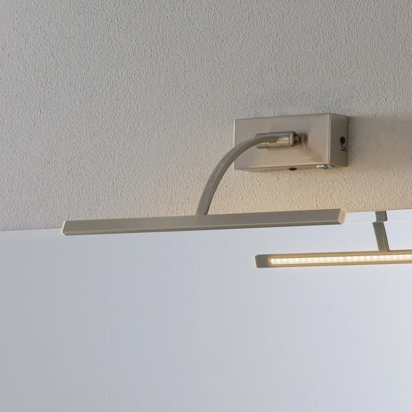 Ściemniany kinkiet LED Matisse z ruchomym ramieniem Nowoczesny i ponadczasowy kinkiet LED Matisse idealnie nadaje się do oświetlania obrazów lub Spiegli. Jej wystające ramię, do którego przymocowana jest wydłużona, wąska głowica oprawy, można przesuwać w górę i w dół. Ułatwia to regulację nie tylko wysokości, ale także kierunku padania strumienia światła. Das emituje światło bezpośrednio na całej długości i świeci ciepłym białym kolorem. W kątowym uchwycie ściennym zintegrowany jest przełącznik. Służy on do włączania i wyłączania światła. Die posiada również ściemniany regulator, który zapamiętuje ostatnio wybrane ustawienie dzięki funkcji pamięci.