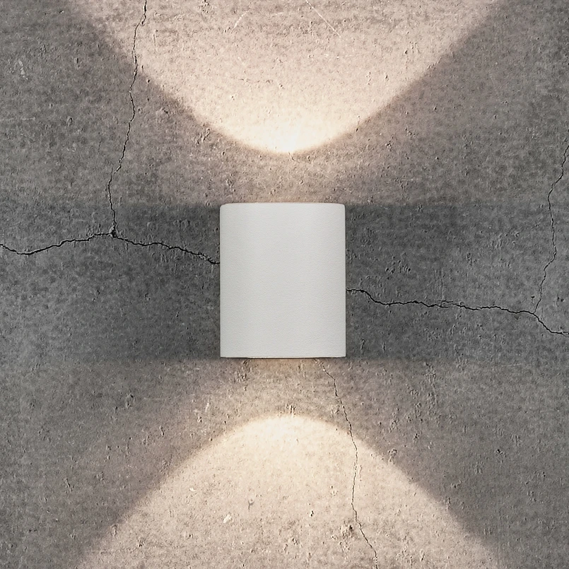 Zewnętrzna oprawa ścienna Canto 2 LED ma kształt prostopadłościanu, zaokrąglonego z przodu, który tutaj odpowiada cylindrowi. Korpus, wykonany z aluminium formowanego wtryskowo, posiada na górze i na dole okrągłe otwory, które są pokryte przezroczystymi szklanymi osłonami. Znajdujące się za nim diody LED emitują ciepłobiałe światło o kącie padania wiązki 120°, które oświetla zewnętrzną powierzchnię w formie oświetlenia góra-dół. Szablony wchodzące w zakres dostawy oferują również możliwość tworzenia dekoracyjnych akcentów na ścianie przy użyciu specjalnie zaprojektowanych wzorów świetlnych.