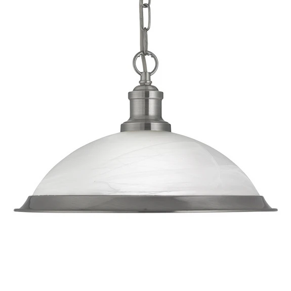 Lampa wisząca Bistro to wyjątkowe urządzenie oświetleniowe, o prostej formie i w nowoczesnych kolorach. Szklany klosz o szlachetnym, białym kolorze zamocowano na rustykalnym, łańcuchowym zawieszeniu, które pełni też dodatkową, praktyczną funkcję – podczas montażu można dostosować jego długość do warunków w pomieszczeniu. Łańcuch ma srebrny kolor, podobnie jak metalowy uchwyt i wąski pasek zdobiący klosz o kontrastującej, delikatnej, marmurkowej powierzchni. Wewnątrz klosza znajduje się oprawka E27 – po wstawieniu w nią odpowiedniej żarówki lampa Bistro wypełni pomieszczenie kameralnym światłem.