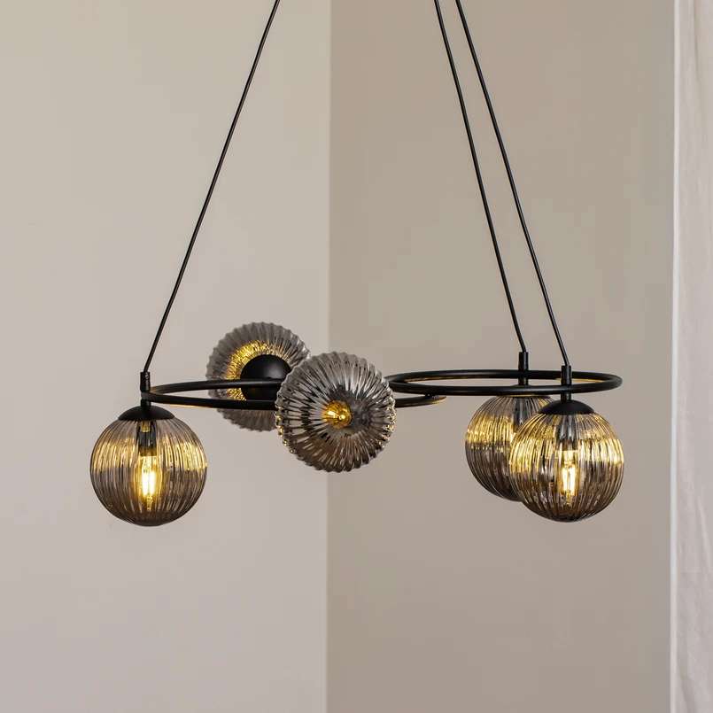 Lampa do salonu Libra: elegancja i wszechstronność w przydymionej szarości i czerni Lampa do salonu Libra łączy nowoczesny design z wysokiej jakości materiałami, takimi jak szkło i stal, oferując stylowe rozwiązanie oświetleniowe. Połączenie przydymionej szarości i czerni nadaje lampie ponadczasowej elegancji, która doskonale komponuje się z różnymi stylami wnętrz. Dzięki średnicy 70 cm i pięciu źródłom światła zapewnia równomierne i przyjemne oświetlenie w salonach i jadalniach. Wyprodukowana w Europie lampa oznacza jakość i trwałość, co czyni ją idealnym wyborem do wyrafinowanych wnętrz - Ściemniana zewnętrznie