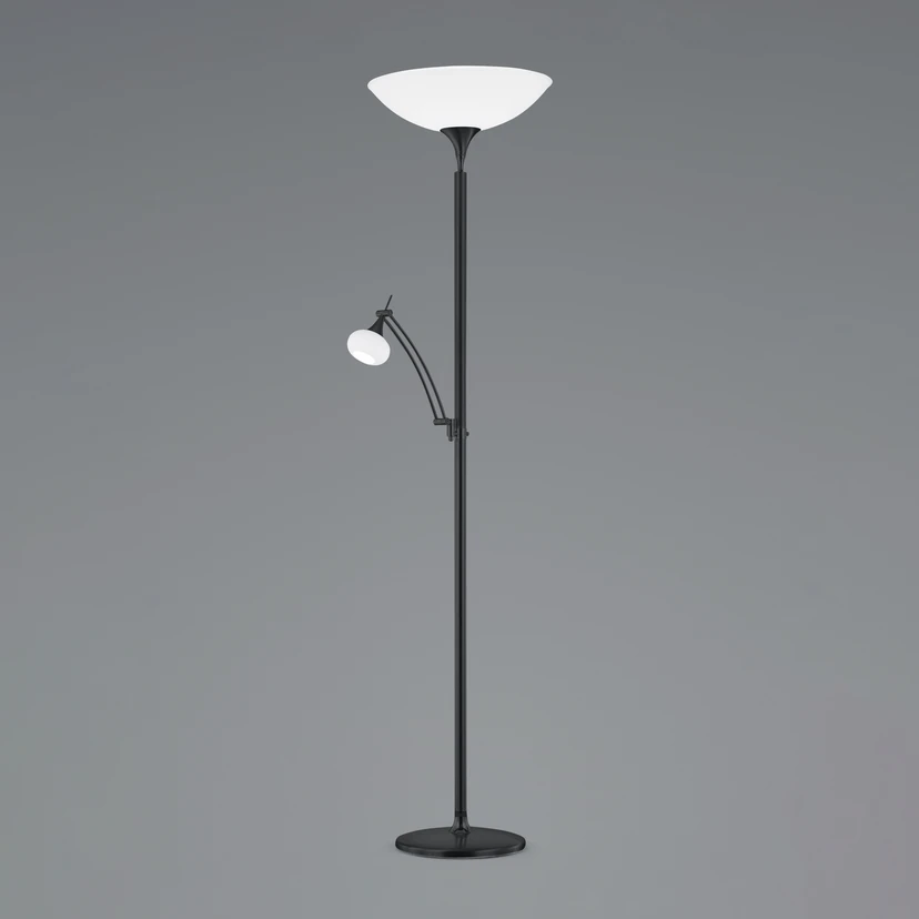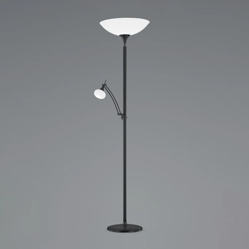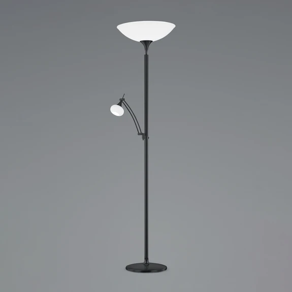 & lampa oświetlająca sufit do czytania: lampa stojąca LED Opera z ramieniem do czytania i ściemniaczem dotykowym, 2 700 K Klasycznie zaprojektowana lampa stojąca LED Opera pełni przede wszystkim funkcję mocnej lampy oświetlającej sufit światłem pośrednim. Zainstalowane wysokiej jakości diody LED emitują przyjemne światło o barwie ciepłej bieli. Intensywność światła może być ściemniana w celu uzyskania przytulnego nastroju za pomocą przełącznika na ramie. Opera jest uzupełniona w tej wersji o dodatkową lampkę do czytania, która jest przymocowana do ramy za pomocą ramienia i może być obracana. Klosze obu źródeł światła wykonane są z opalowego białego szkła, co zapewnia nieoślepiającą emisję światła. Czarna rama została wykonana ręcznie z mosiądzu, a producent BANKAMP, znany jako producent wysokiej jakości opraw oświetleniowych od 1947 roku, produkuje Operę w Niemczech.