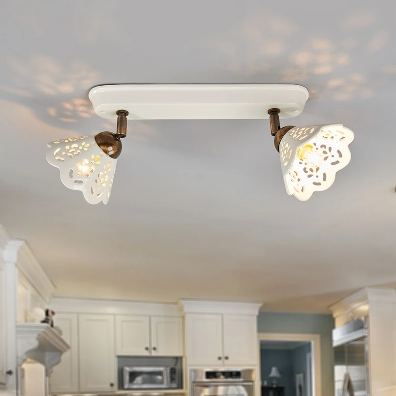 Zachwycający design do marzycielskich pomieszczeń - lampa ścienna i sufitowa PorticoTa wyjątkowo urocza lampa ścienna Portico może być również używana jako lampa sufitowa. Każdy, kto kocha romantyczny, marzycielski styl wiejskiego domu, natychmiast zakocha się w tym modelu. Białe szkliwione ceramiczne klosze ze szczególnie dekoracyjnym wzorem loków i zakrzywioną krawędzią zapewniają czysty romantyzm! Jakość, na której można polegaćLampa, która przypomina koronkową tkaninę, nie tylko zapewnia radość dzięki swojemu wyjątkowemu wzornictwu, ale także oferuje bardzo wyjątkową wysoką jakość. Nawet uchwyt ścienny ze specjalną ceramiczną szyną został idealnie dopasowany do projektu lampy i przetworzony zgodnie z wysokimi standardami. To udane połączenie zapewnia również prawdziwy entuzjazm wśród miłośników stylu vintage!