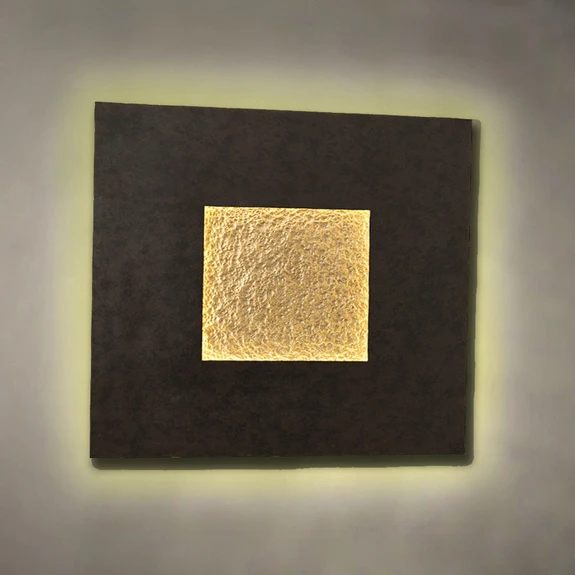 Kinkiet LED osiąga wspaniały efekt w każdym przypadku, niezależnie od tego, czy jest włączony, czy wyłączony. Eclipse składa się z kwadratowej żelaznej ramy w kolorze brązowo-czarnym, powierzchnia mniejszego, wewnętrznego kwadratu jest młotkowana w kolorze złotym. Stwarza to wrażenie obiektu sztuki nowoczesnej. Przy włączonym oświetleniu - zainstalowana jest taśma LED o barwie ciepłej bieli - zarówno ramka wokół, jak i kwadrat w kolorze złota są pośrednio podświetlone.
