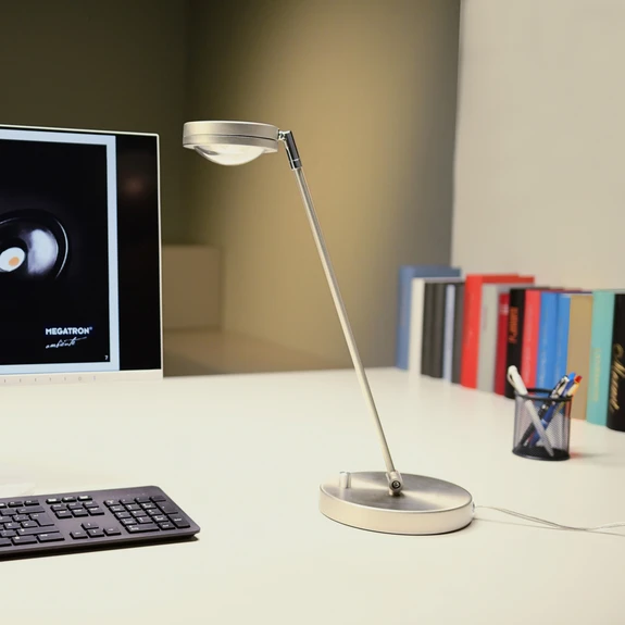 Kompaktowa lampka biurkowa LED Ottica ze zintegrowanym ściemnianym designem Lampka biurkowa LED Ottica jest zarówno ponadczasowo elegancka, jak i zajmuje niewiele miejsca, dzięki czemu stanowi elastyczne źródło światła. Głowicę lampy można obracać i odchylać, a ramę można również przechylać i indywidualnie ustawiać. W okrągłej podstawie zintegrowano ściemniacz obrotowy, za pomocą którego można płynnie regulować jasność w zakresie od 100% do 10%. Ciepłe światło oświetla dużą powierzchnię, taką jak biurko, a wbudowane źródło światła Brighteye charakteryzuje się wyjątkową technologią oświetleniową z imponującymi efektami optycznymi i jest szczególnie przyjazne dla oczu. Pod koniec okresu eksploatacji źródło światła LED można łatwo wymienić bez użycia narzędzi. Wymienne źródło światła można zakupić bezpośrednio w akcesoriach - "Fair trade LED" (sprawiedliwa społecznie produkcja, uczciwa praca i standardy socjalne) - 5-letnia gwarancja producenta - przyjazne dla środowiska opakowanie bez plastiku - bardzo dobre oddawanie barw (CRI >93)