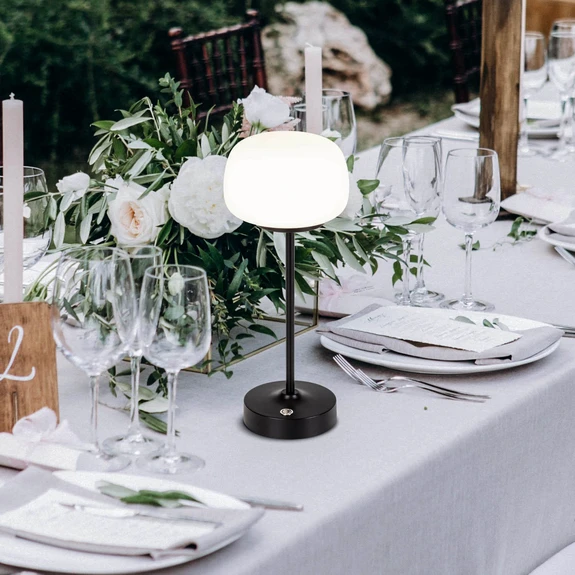 Lampa stołowa LED Pina z akumulatorem i ściemniaczem dotykowym Akumulatorowa lampa stołowa LED Pina to mobilne dodatkowe źródło światła, które wzbogaca salony i pokoje dzienne. Jej kolorowa metalowa rama podtrzymuje okrągły klosz wykonany z matowego szkła, w którym znajduje się źródło światła LED o barwie ciepłej bieli. Moc światła można regulować za pomocą ściemniacza dotykowego na podstawie. Poprzednio wybrana jasność jest ponownie dostępna po ponownym włączeniu (funkcja pamięci) - Czas ładowania: 4 h - Czas świecenia na jednym ładowaniu: 5 h - Wejście ładowania: USB-C