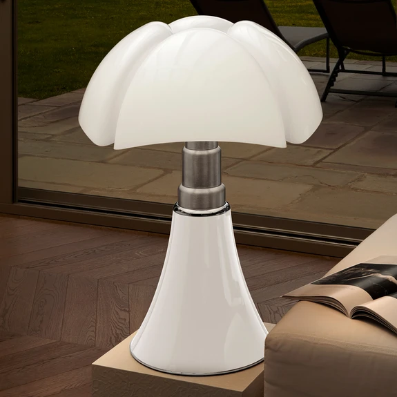Już po pierwszym spojrzeniu na tę lampę zrozumiemy, dlaczego wygrała ona liczne konkursy designu. PIPISTRELLO bowiem jest dziełem sztuki z włoskiej pracowni designerskiej Martinelli Luce. Składa się ona z lakierowanej barwnie metalowej nogi, ukoronowanej czteroczęściowym kloszem z kolorze mlecznej bieli. Pomiędzy nogą a kloszem znajduje się teleskopowy drążek ze stali szlachetnej, pozwalający na regulację wysokości lampki w zakresie od 66 cm do maks. 86 cm. Przez matową powierzchnię klosza emitowane jest równomierne światło, wnoszące przyjemne akcenty i nastrojową atmosferę.
