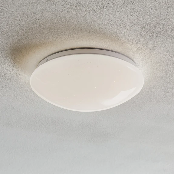 Lampa sufitowa LED Moon z dekorem gwiazdy i trybem RGB Lampa sufitowa LED Moon tworzy piękną atmosferę dzięki dekorowi gwiazdy, barwie światła ciepłej bieli i trybowi RGB w trzech kolorach: czerwonym, zielonym i niebieskim. Die jest wykonana z metalu i tworzywa sztucznego i ma okrągły kształt. Światło, a także ściemniane natężenie światła, można wygodnie regulować za pomocą dołączonego pilota. Sam zdecyduj, czy chcesz, aby pokój świecił jasnym blaskiem, czy tylko przytulnie migotał - dzięki funkcji lampki nocnej