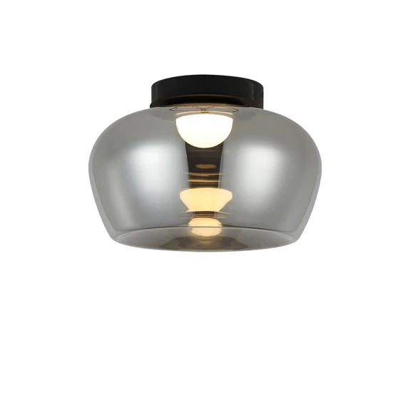 Lampa sufitowa LED Nadia wyposażona jest w czarną, okrągłą metalową rozetę oraz duży, przezroczysty klosz w kolorze dymnej szarości. Zintegrowane źródło światła LED zapewnia równomierne oświetlenie w ciepłej bieli, które dzięki zabarwieniu szkła wygląda wyjątkowo efektownie. Efektowna lampa sufitowa do podstawowego oświetlenia pomieszczeń mieszkalnych i korytarzy.