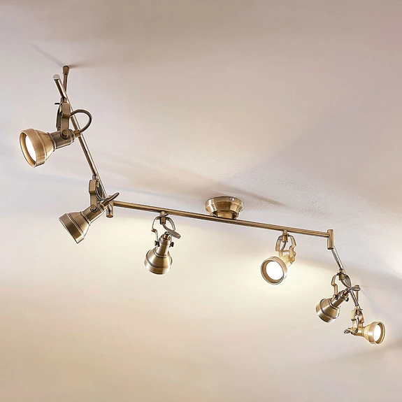 Lampa sufitowa Perseas w kolorze antycznego mosiądzu z 6 regulowanymi kloszami Ta podłużna lampa sufitowa ma klasyczny wygląd, ponieważ rama i klosze mają wykończenie w kolorze antycznego mosiądzu. Dzięki temu bardzo dobrze komponuje się z wnętrzami urządzonymi w bardziej tradycyjnym stylu. Ponieważ każdy reflektor można regulować, Perseas idealnie nadaje się do niestandardowych rozwiązań oświetleniowych, a dzięki 6 gniazdom GU10 lampa sufitowa może również z łatwością oświetlać większe pomieszczenia bez szczególnego wzrostu zużycia energii.