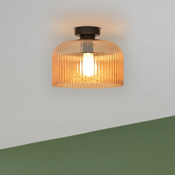 Lampa sufitowa Luigi, wykonana ze szkła i metalu, dzięki połączeniu bursztynowych i czarnych elementów nadaje pomieszczeniu stylowy i ponadczasowy wygląd. Wyrazista forma i harmonijna kolorystyka sprawiają, że przyciąga ona wzrok w różnych pomieszczeniach mieszkalnych, od salonu przez jadalnię po kuchnię i przedpokój.