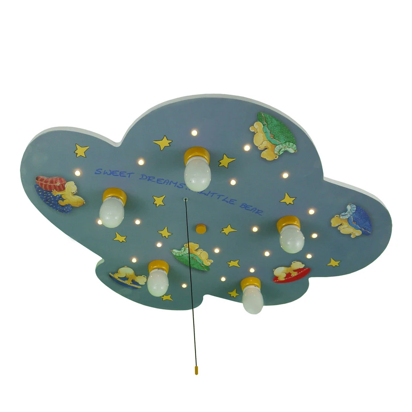 Lampa sufitowa Bear to typowa lampa do pokoju dziecięcego, która przekonuje motywem przyjaznym dziecku. Mnóstwo gwiazd i sześć śpiących małych niedźwiedzi rozmieszczonych jest na lampie sufitowej w kształcie chmury. Podstawowym kolorem lampy jest niebieski. Pięć głównych źródeł światła jest rozmieszczonych w okręgu i włącza się je i wyłącza za pomocą wahadła rysunkowego na lampie. Ponadto na oprawie zainstalowanych jest 20 punktów świetlnych LED, które są włączane/wyłączane za pomocą przełącznika ściennego. Po uruchomieniu wyłącznika pomieszczeniowego następuje reaktywacja poprzedniego scenariusza oświetlenia. Jeśli lampy E14 zostały oświetlone, przywracane jest pełne oświetlenie. Jeżeli główne źródła światła zostały wyłączone, po włączeniu oprawy za pomocą przełącznika ściennego, który zapewnia orientację w ciemności, aktywowana jest tylko funkcja światła drzemiącego.