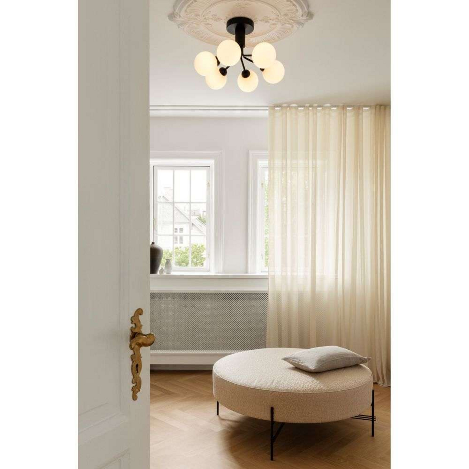 Lampa sufitowa Apiales 6 łączy w sobie skandynawską prostotę z luksusowym wyglądem. Stanowi stylowy akcent w salonach i jadalniach. Harmonijne połączenie czarnej metalowej ramy i ręcznie dmuchanych opalowych kloszy zapewnia zrównoważony wygląd, który idealnie wpisuje się w różne koncepcje aranżacji wnętrz.