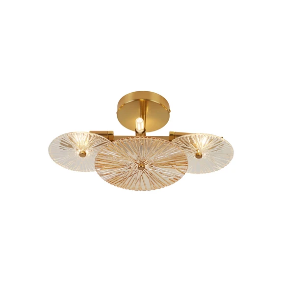 Lampa sufitowa Wagon Wheel z teksturowanym szkłem Lampa sufitowa Wagon Wheel to HighLight, który bez wysiłku podkreśli każdy nowoczesny wystrój. Aura elegancji i wyrafinowania sprawia, że ta lampa sufitowa wzbogaci każdy salon, jadalnię lub przedpokój. Wagon Wheel posiada przezroczyste i bursztynowe, teksturowane szklane dyski, które rozpraszają światło i tworzą czarujące wzory w pomieszczeniu. Lakierowana stalowa rama w kolorze mosiądzu pięknie uzupełnia całość. Wagon Wheel oferuje miejsce na sześć dowolnie wybranych żarówek G9 (patrz akcesoria).