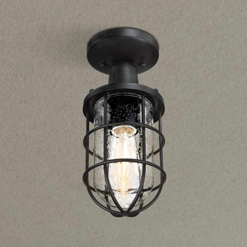 Zewnętrzna lampa sufitowa Crestview w kształcie klatki wykonana ze stali i ręcznie dmuchanego antycznego szkła Solidna obudowa zewnętrznej lampy sufitowej Crestview wykonana jest ze stali o teksturowanej powierzchni w kolorze czarnym i ma kształt klatki. Wewnątrz znajduje się szklany klosz z drobnymi wtrąceniami powietrza. Antyczne szkło tworzy lekko rozproszone światło i jest bardzo atrakcyjne do oglądania z bliska, gdy ta lampa sufitowa nie jest włączona. Crestview doskonale nadaje się do użytku na zewnątrz, na przykład nad wejściem, a także w piwnicach, ponieważ jest chroniona przed bryzgami wody (IP44). W ręcznie dmuchanym szklanym kloszu można stosować żarówki żarnikowe, a w celu stworzenia wyjątkowo przyjemnej atmosfery można użyć żarówek przyciemnianych.