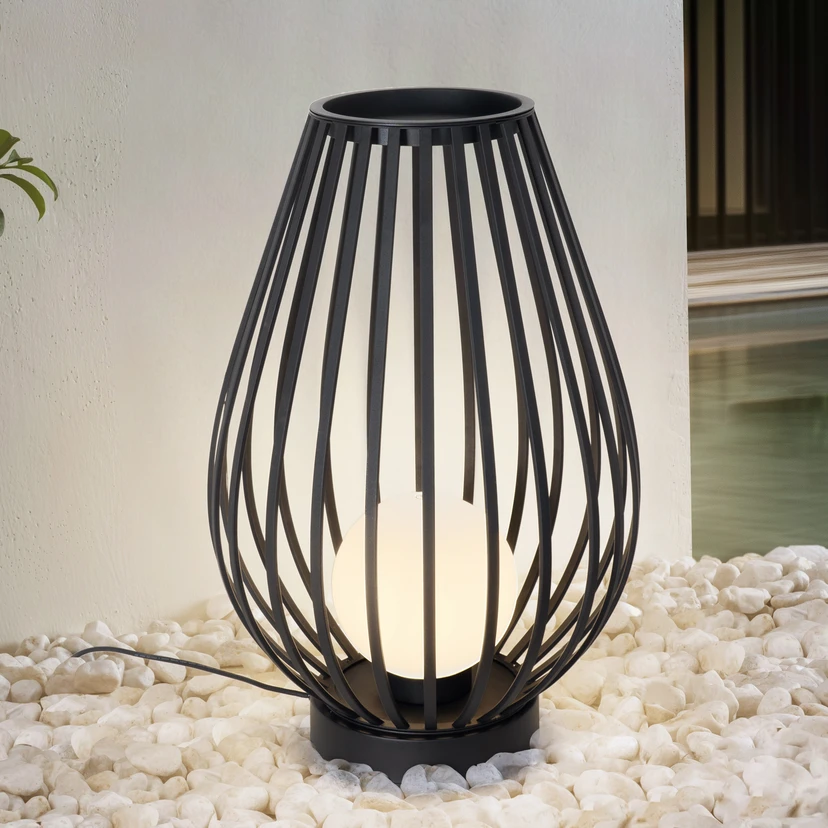 Lampa tarasowa Marrin w nowoczesnym kształcie klatki Lampa tarasowa Marrin łączy w sobie nowoczesny design z funkcjonalnością wymaganą w obszarach zewnętrznych. Nowoczesny styl znajduje odzwierciedlenie w wyraźnych liniach i ciemnej estetyce, która zanurza każde patio w stylowej atmosferze. Dzięki stopniowi ochrony wynoszącemu co najmniej IP44, lampa ta jest optymalnie chroniona przed żywiołami, co czyni ją idealną do użytku na zewnątrz.