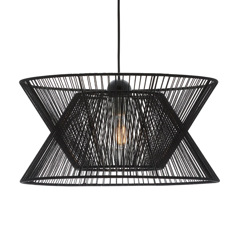 Podwójny klosz opleciony liną - lampa wisząca ArgelaLampa wisząca Argela ma naturalny i wyjątkowy design. Dwa klosze lampy są skierowane do siebie i przeplatają się. Naturalne liny są oplecione wokół konstrukcji z tworzywa sztucznego, które czasami są gęstsze, a czasami mają więcej wolnej przestrzeni i odsłaniają widok źródła światła. Ta wyrafinowana oprawa zwisa z czarnego, okrągłego baldachimu i jest wyposażona w czarne okucia. Lampa wisząca Argela doskonale komponuje się z rustykalnymi, skandynawskimi, a także nowoczesnymi wnętrzami. Pasująca żarówka E27 nie jest dołączona do zestawu, ale można ją kupić za pośrednictwem akcesoriów.