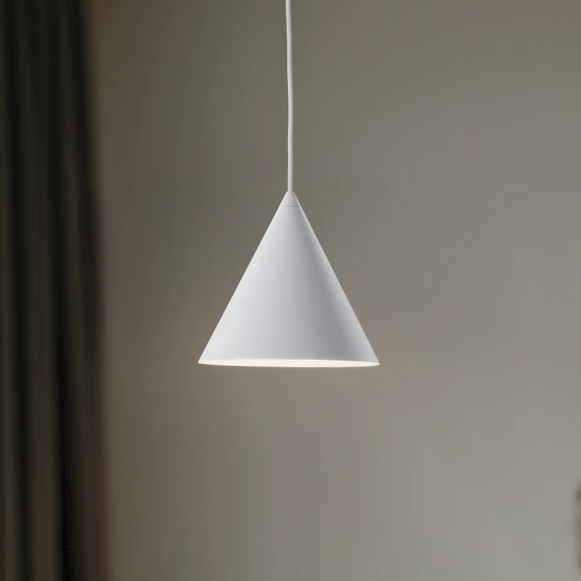 Lampa wisząca Cono w kształcie stożka w kolorze białym Klosz lampy wiszącej Cono jest wykonany ze stali w ponadczasowym kształcie stożka i wykończony w matowej bieli. Światło jest emitowane w dół, dzięki czemu lampa wisząca idealnie nadaje się do oświetlenia stołu lub powierzchni.