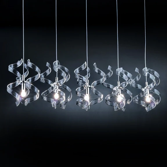 Lampa wisząca Crystal zachwyca obfitym oświetleniem, ponieważ pięć skierowanych w dół gniazdek jest ograniczonych jedynie przez szklane elementy dekoracyjne. Kompozycja przezroczystości i chromu szczególnie dobrze wpisuje się w nowoczesny i minimalistyczny styl. Elementy dekoracyjne wykonane z giętego szkła wokół opraw działają zarówno odbijająco, jak i odbijają światło, a także inspirują swoim ekstrawaganckim kształtem.