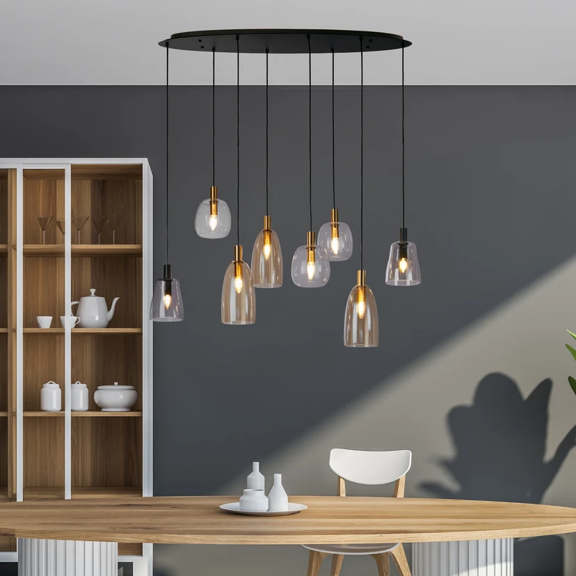 8-punktowa lampa wisząca Divine z różnymi szklanymi kloszami Wielopłaszczyznowa lampa wisząca Divine opada z lakierowanej na czarno, owalnej stalowej rozety. Do niego przymocowanych jest osiem szklanych kloszy o różnych kształtach i odcieniach. Oprócz kloszy wykonanych z przezroczystego szkła, dostępne są klosze o przydymionym szarym odcieniu i klosze o bursztynowym wyglądzie. Divine oferuje miejsce na osiem dowolnie wybieranych źródeł światła E14 (patrz akcesoria).