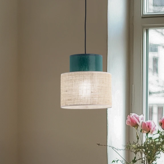Przytulna lampa wisząca Duo z dwuwarstwowym kloszem z tkaniny jutowej Lampa wisząca Duo ma atrakcyjny klosz z tkaniny składający się z dwóch cylindrycznych kul w kolorze benzyny i jasnego naturalnego brązu. Zawieszenie z okrągłą rozetą jest w kolorze czarnym.