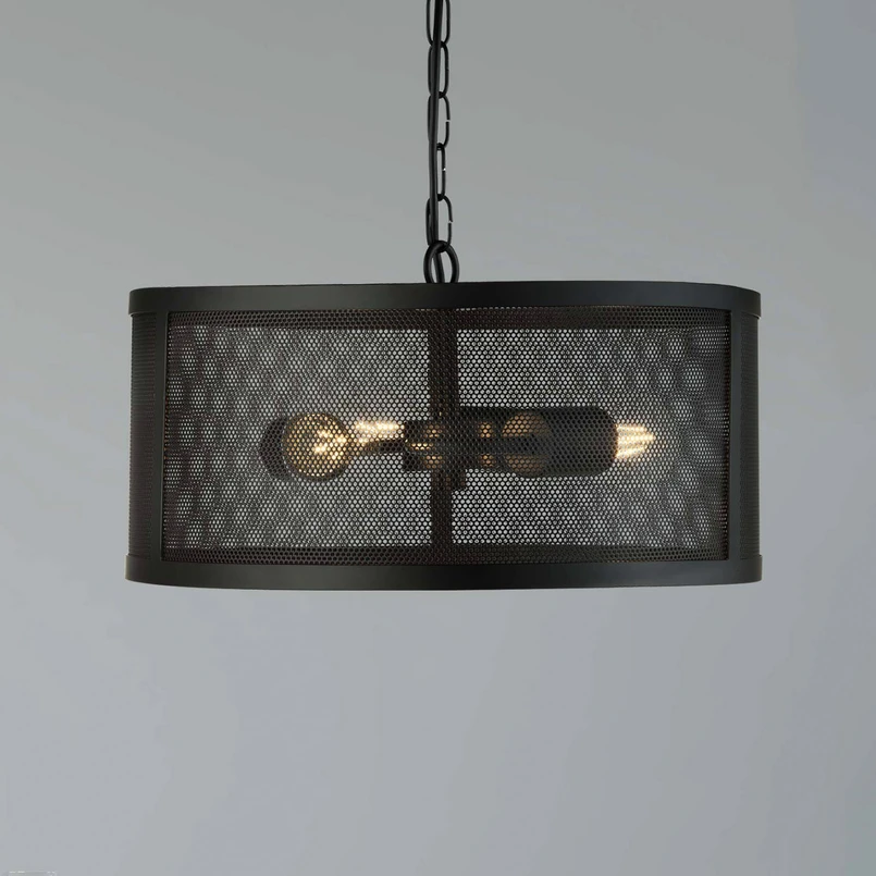 Jak sama nazwa wskazuje, klosz trzylampowej lampy wiszącej Fishnet składa się z drobno tkanej siatki z matowego, pomalowanego na czarno metalu, która jest owinięta wokół metalowych rozpórek. Przez siatkę widoczne są trzy gniazda znajdujące się pośrodku klosza, a tym samym również wykorzystywane źródła światła, dzięki czemu zaleca się stosowanie żarówek dla uzyskania pięknego wyglądu.