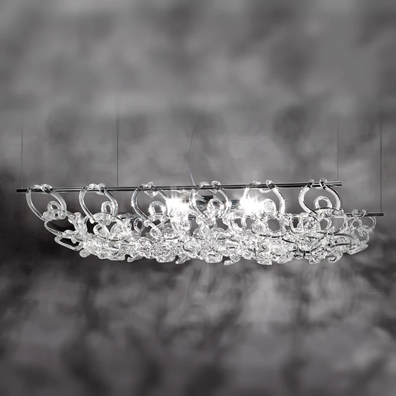 Dla ekskluzywnego projektu Giogali3D, rurki z dmuchanego szkła przetworzono z namiętnością i zrozumieniem sztuki na indywidualne, mocno zakrzywione elementy. Mają one zdolność do załamywania padającego światła i odbijania go z powrotem do otoczenia w zmodyfikowanej formie z efektem iskrzenia. Wiele tych małych szklanych dzieł sztuki zostało ekspresyjnie zaklinowanych w kloszu tej 4-punktowej lampy wiszącej, tworząc w ten sposób wydłużoną misę, która unosi źródła światła i ma doskonały wygląd. Przytrzymują ją dwa filigranowe drążki, które harmonizują ze szklaną plecionką o chromowanym wyglądzie i tworzą fascynujący efekt nieważkości dzięki niepozornym drutom zawieszenia. Szkło i otwarta konstrukcja kształtu stworzonego przez Giogali3D rzucają imponujące wzory na ściany pomieszczenia. Lampa wisząca tworzy w ten sposób urokliwy nastrój w każdym salonie.
