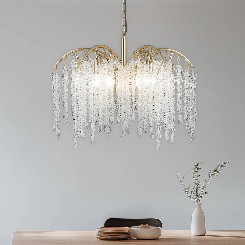 Opulentna lampa wisząca Grape w wykończeniu antycznego mosiądzu ze szklanymi zawieszkami Lampa wisząca Grape zapewnia iskrzące doznania świetlne. Łącznie dwanaście opraw znajduje się pomiędzy pasmami wyposażonymi w szklane elementy, tworząc nastrojowe załamania światła. Wystająca metalowa konstrukcja, łańcuchowe zawieszenie i okrągła rozeta mają wykończenie w kolorze antycznego mosiądzu.