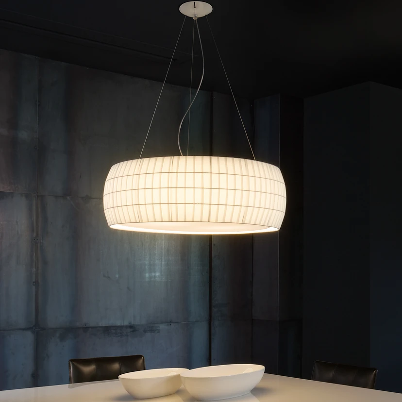 Ponadczasowa oprawa wisząca Isamu z perłowo-białym kloszem wykonanym z jedwabiu poliestrowego Dzięki lekko przezroczystej, przypominającej jedwab tkaninie poliestrowej rozciągniętej wokół wewnętrznej struktury i rozpraszającemu światło dyfuzorowi z poliwęglanu zakrywającemu pionowy otwór klosza, oprawa wisząca Isamu jest przyjemnym źródłem światła w salonach i pokojach dziennych. Posiada również zawieszenie z trzema smukłymi kablami i biały, okrągły daszek. Za koncepcję serii opraw Isamu odpowiadają Daniel Vila i Ester Pujol, założyciele hiszpańskiego studia projektowego Nahtrang.