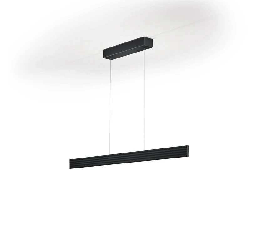 Oprawa wisząca LED Fara przekonuje funkcjonalnym, współczesnym źródłem światła do nowoczesnych salonów i pokoi dziennych. Smukły prostokątny profil tworzy korpus oprawy. Światło emitowane jest w górę i w dół, za pomocą oddzielnych diod LED, którymi można sterować osobno. Ich światło oferuje szczególnie dobre oddawanie barw (CRI 90), może być ściemniane i regulowane od ciepłej bieli do szczególnie przytulnej temperatury barwowej (Dynamic White). Daszek jest w tym samym kolorze co oprawa, a do zawieszenia służą dwie smukłe linki.